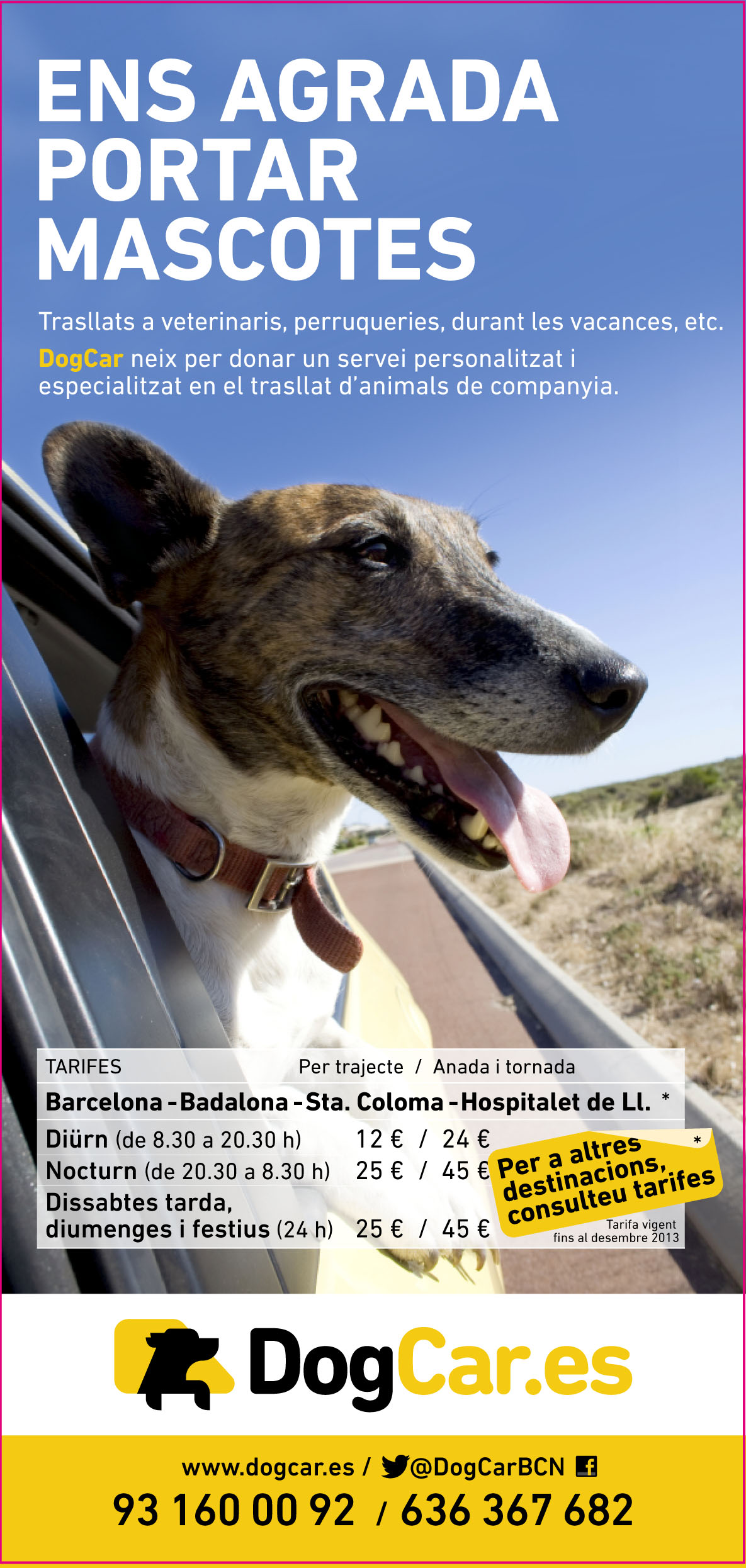 Son molts els serveis i les possibilitats que des de DogCar volem proporcionà. no dubti en contactar amb nosaltres per qualsevol qüestió que l'hi pugui sorgir, es la manera mes fàcil y econòmica de fer el seus trasllats amb la millor companyia possible, la seva mascota.